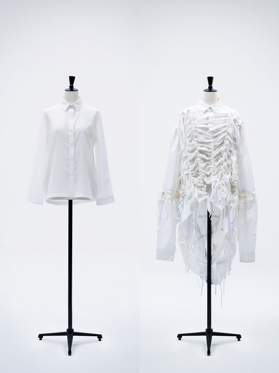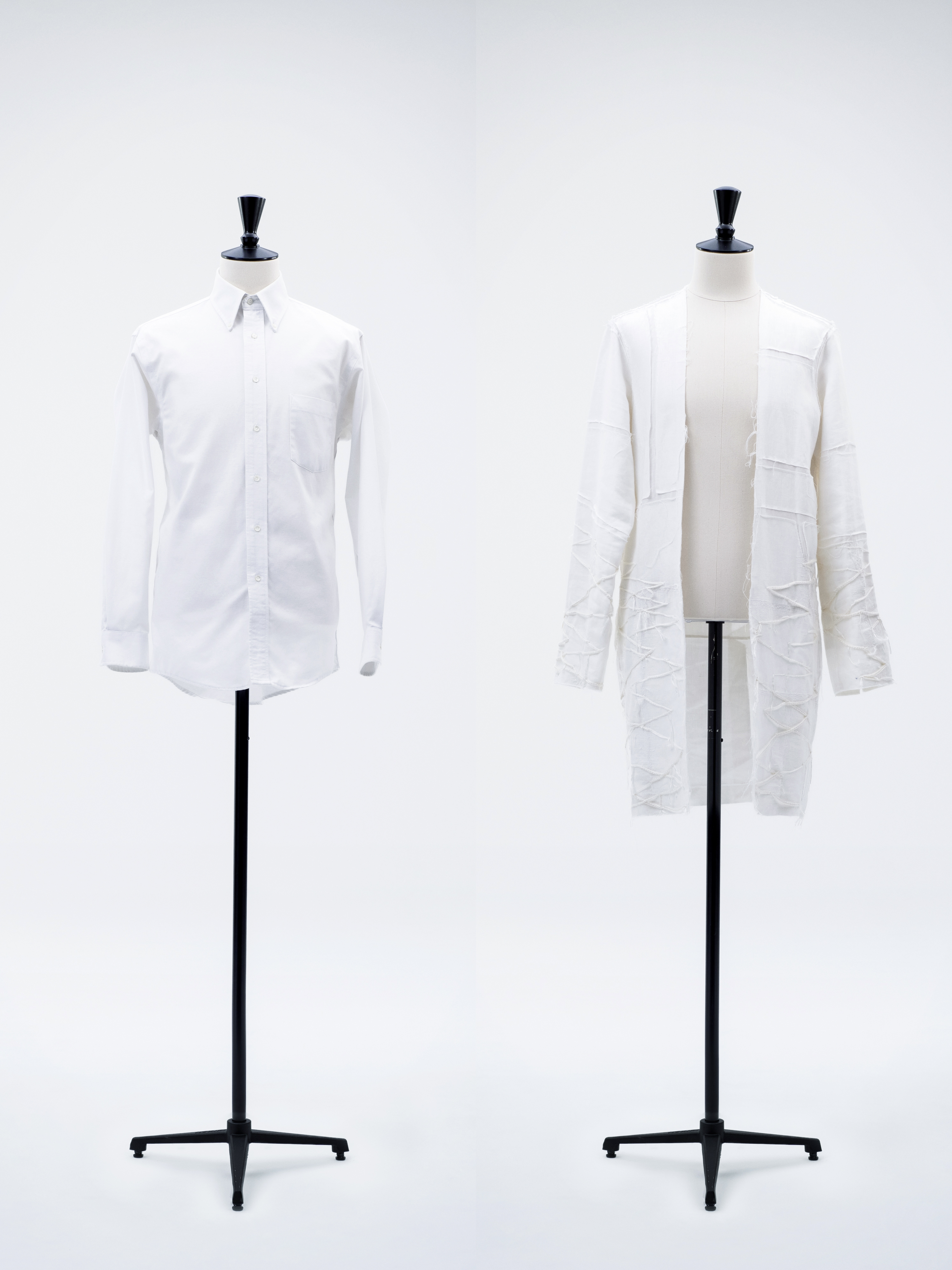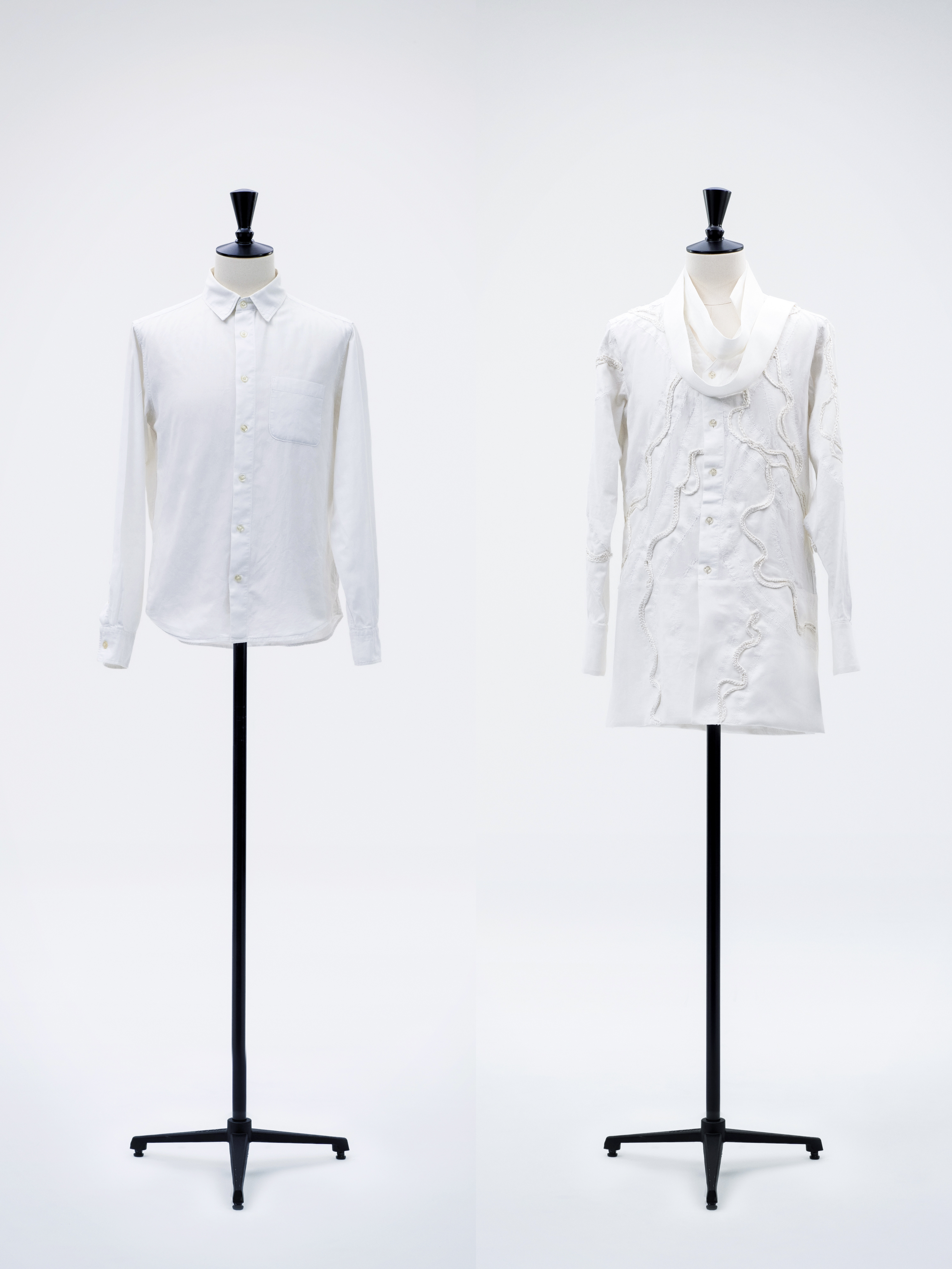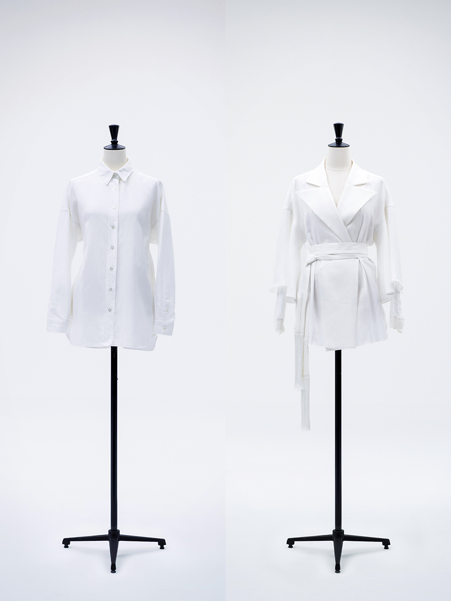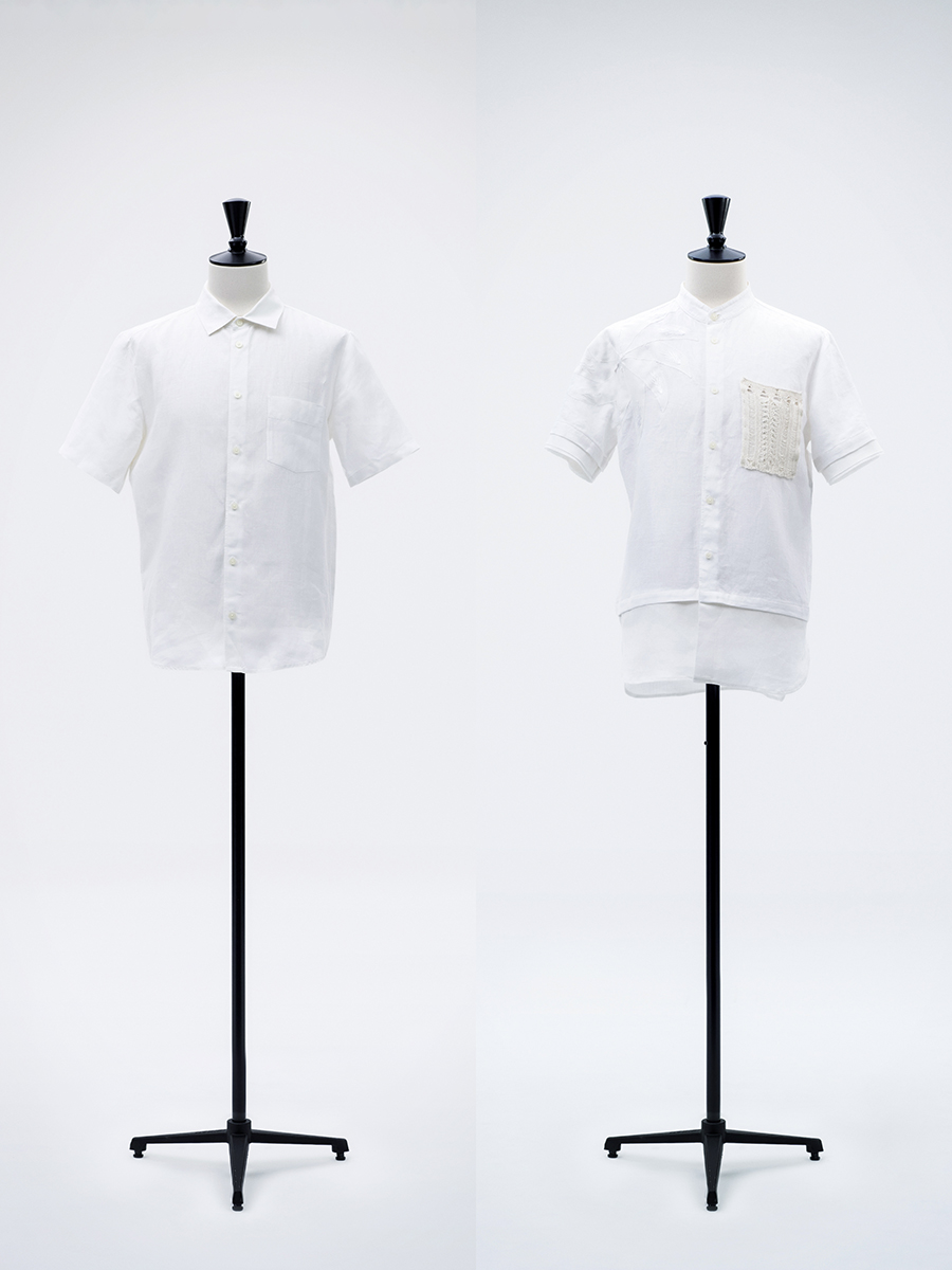 Made-to-order garments usually require physically meeting a client, and an understanding of clients’ needs and sizes through real-life dialogues and measurements. For this project, we delivered final products with all client interactions taken online. In order to create a truly one-of-a-kind garment for each of them, we asked them to provide a white shirt of their own, and asked about stories that were tied to those shirts. We then, brought the white shirt to YUIMA NAKAZATO’s atelier in Tokyo. We used the dialogue as an inspiration to reimagine it, redesign it, and return it to clients as a completely new garment. This is a project where clients and the designer co-create a new garment. In hopes that garments we created together make clients more cheerful, we offered the entire service free of charge as charity.
