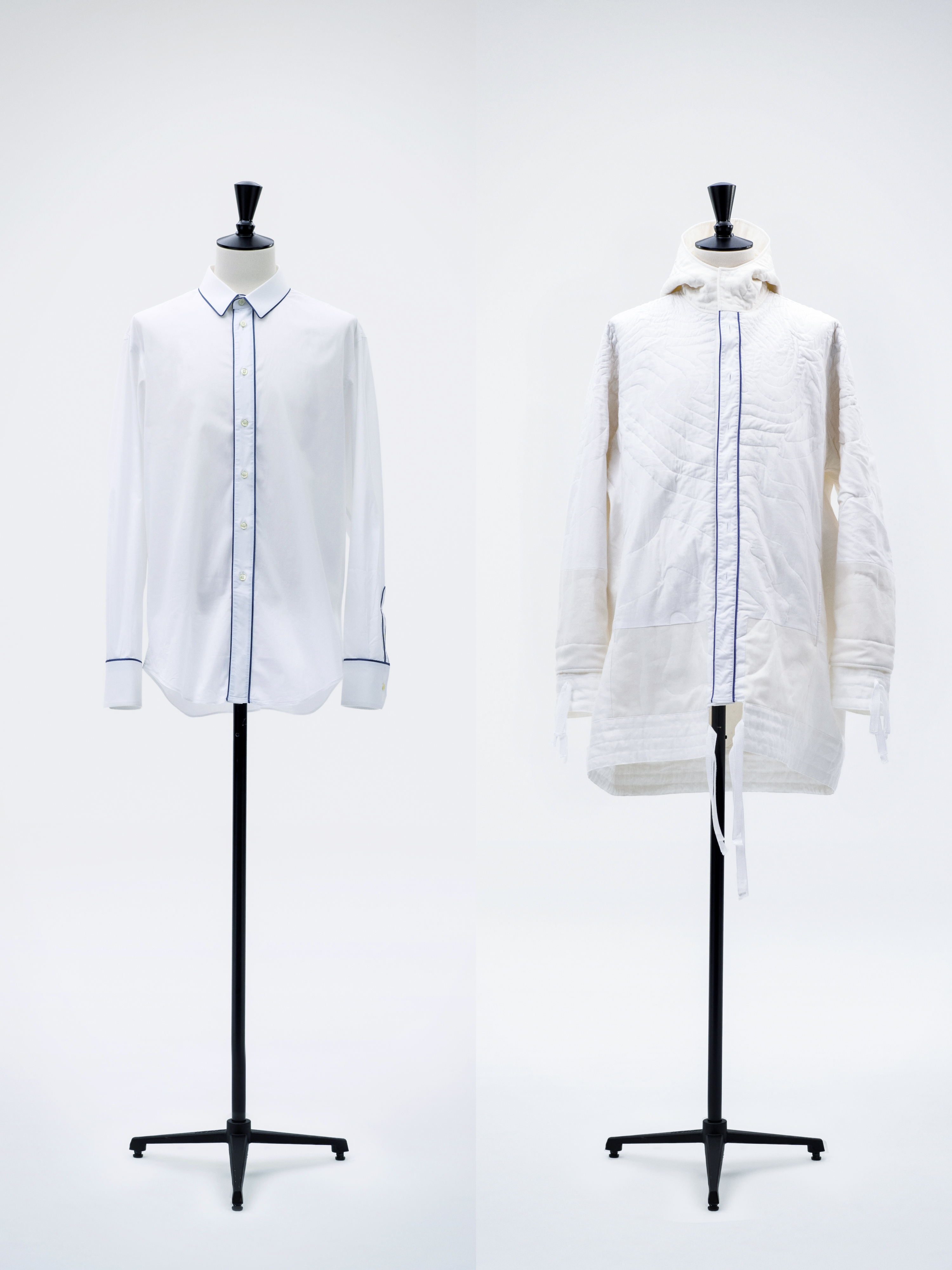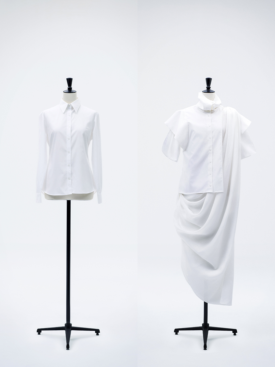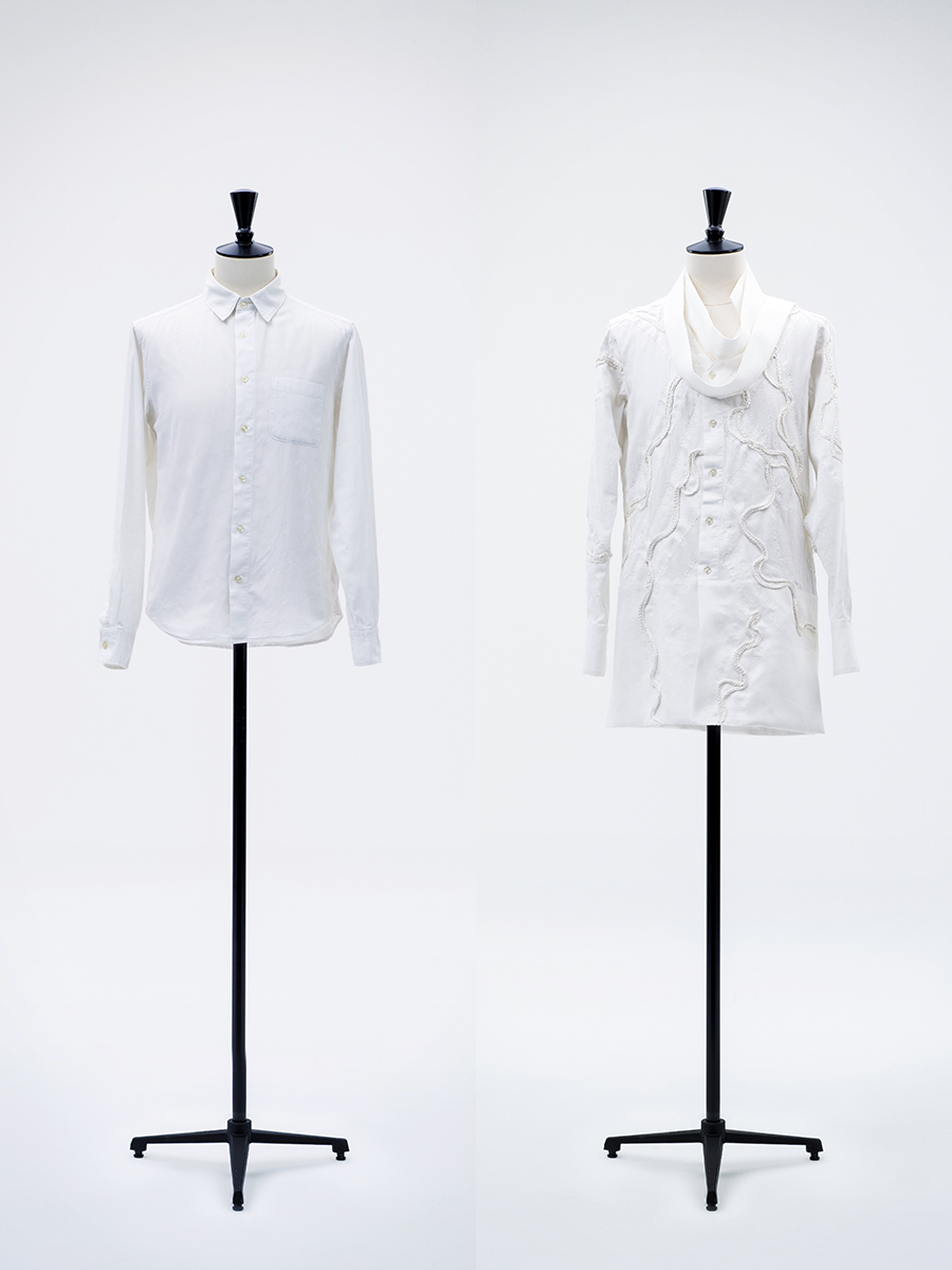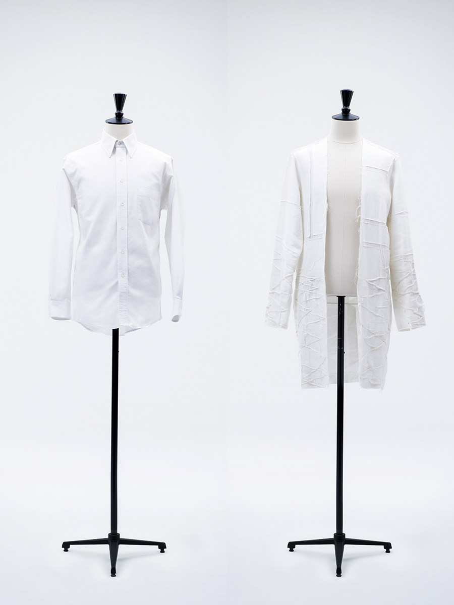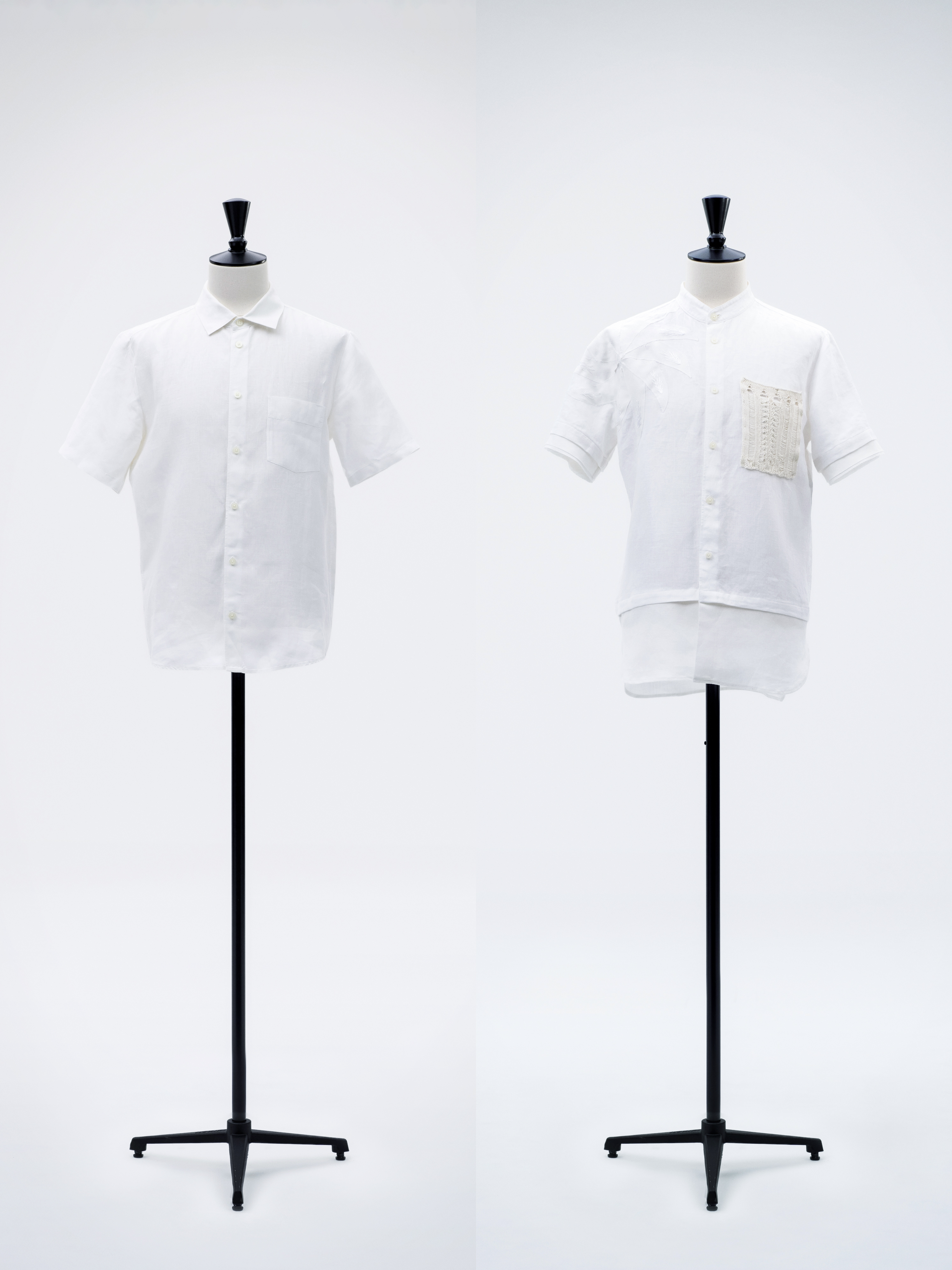 Made-to-order garments usually require physically meeting a client, and an understanding of clients’ needs and sizes through real-life dialogues and measurements. For this project, we delivered final products with all client interactions taken online. In order to create a truly one-of-a-kind garment for each of them, we asked them to provide a white shirt of their own, and asked about stories that were tied to those shirts. We then, brought the white shirt to YUIMA NAKAZATO’s atelier in Tokyo. We used the dialogue as an inspiration to reimagine it, redesign it, and return it to clients as a completely new garment. This is a project where clients and the designer co-create a new garment. In hopes that garments we created together make clients more cheerful, we offered the entire service free of charge as charity.