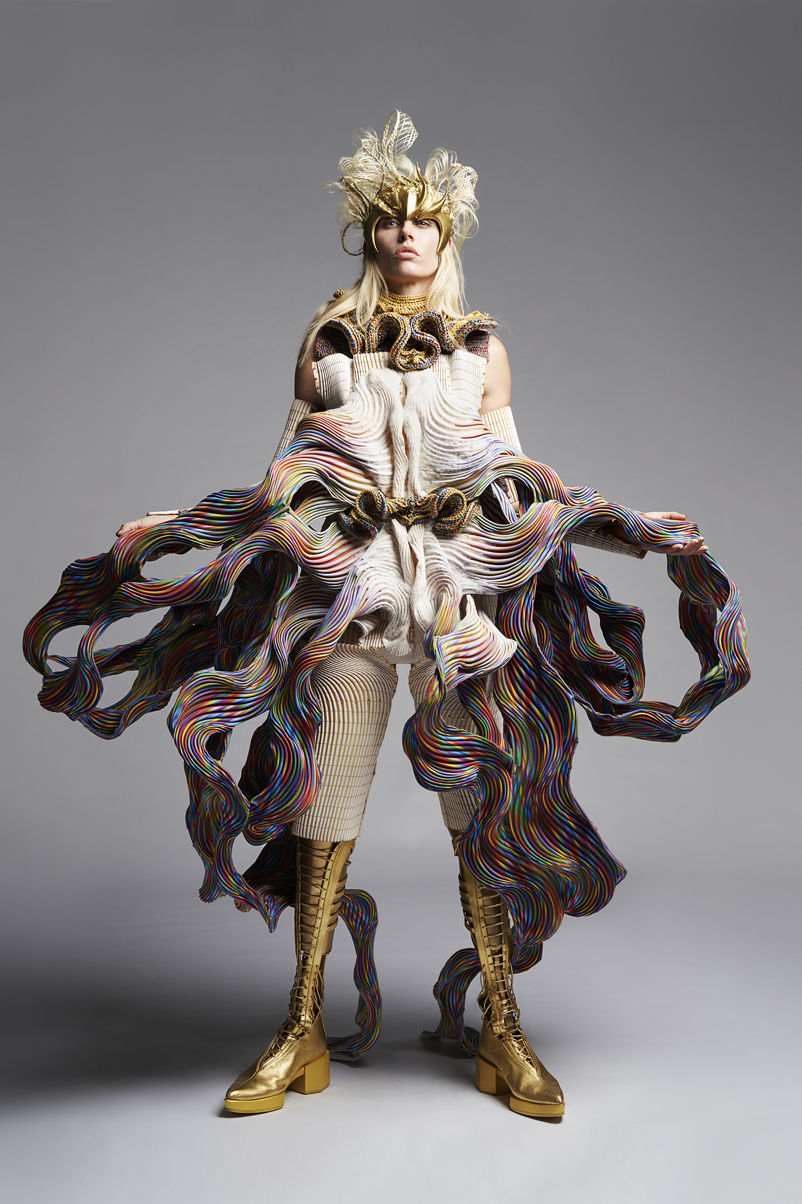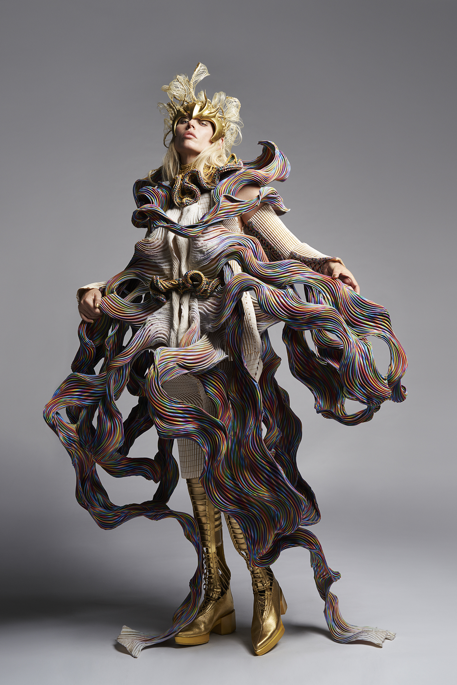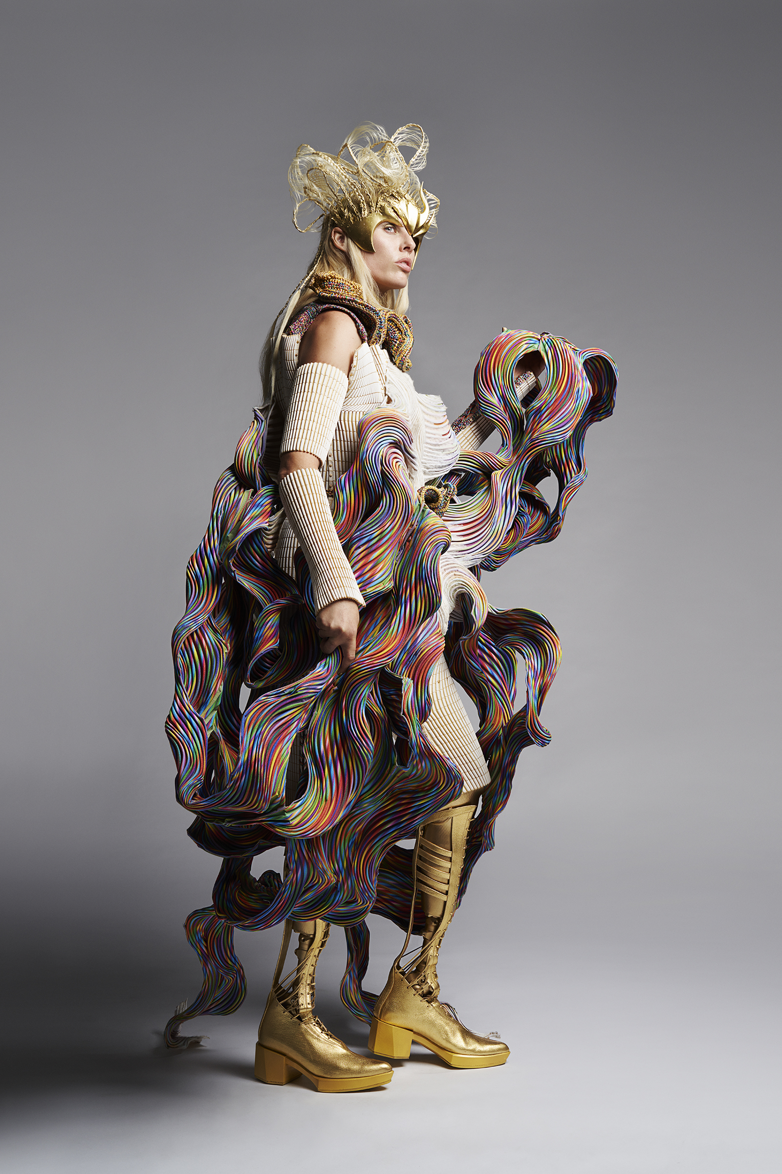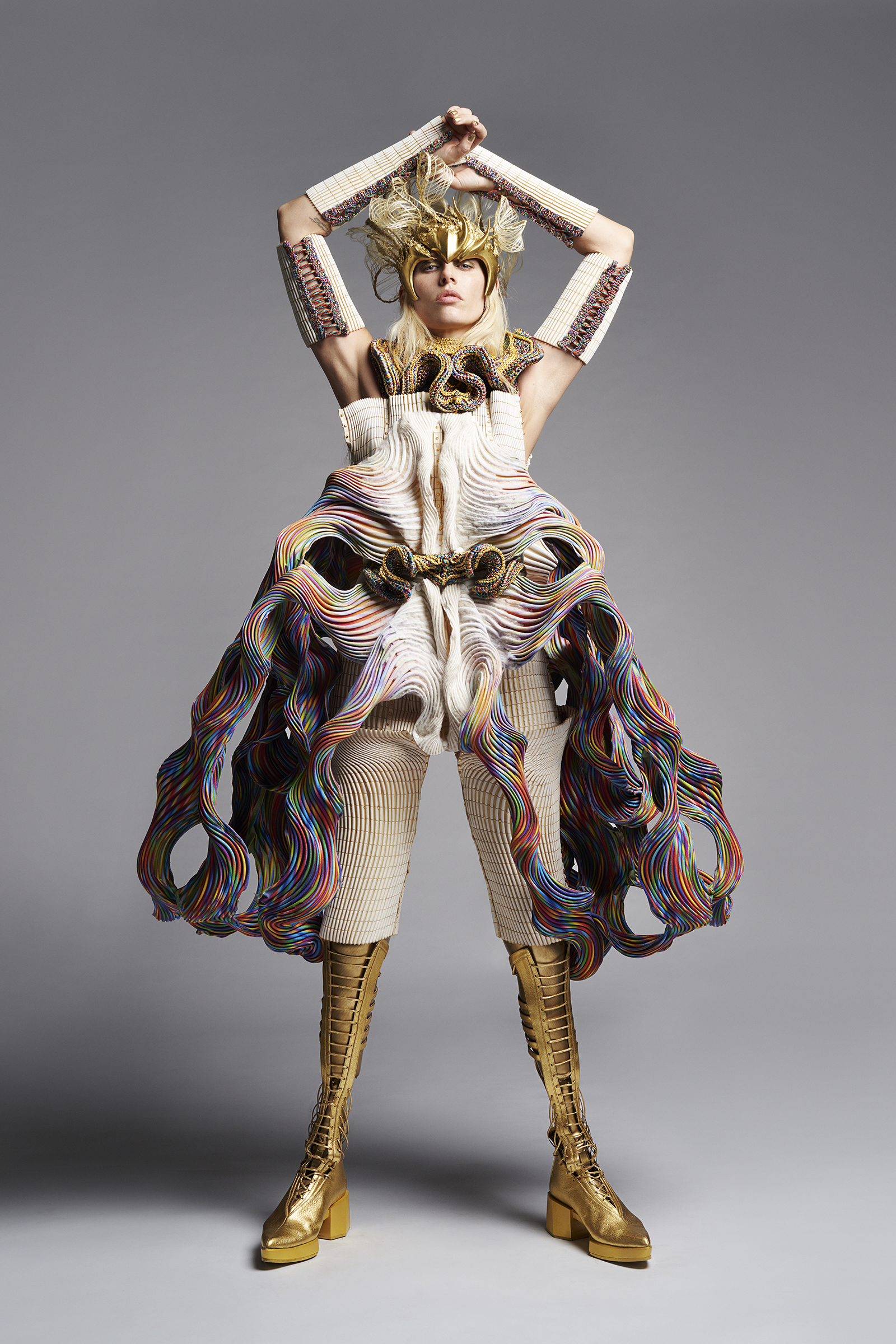 The look was created by leveraging various cutting-edge technologies. By applying our proprietary digital processing technology (Biosmocking) to a unique synthetic protein material (Brewed Protein™), we created highly complex three-dimensional shapes that embody physical details of their wearer and which far exceed anything which could be produced by hand. Importantly, given the current global environment, this project also served as a demonstration of our ability to create individualized pieces despite the challenges posed by the physical distance between the designer and the customer.